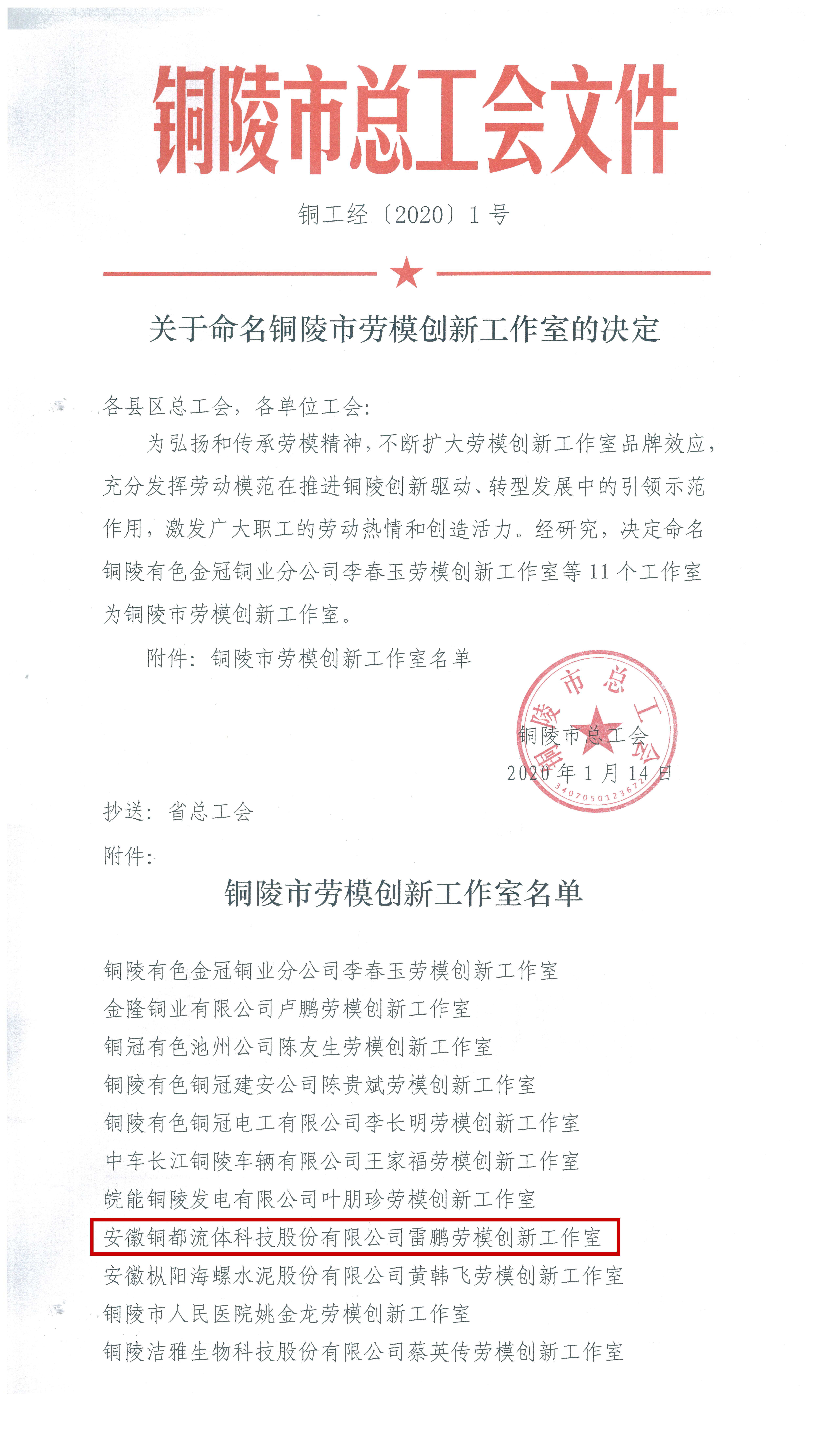 為弘揚(yáng)和傳承勞模精神,不斷擴(kuò)大勞模創(chuàng)新工作室品牌效應(yīng),充分發(fā)揮勞動(dòng)模范在推進(jìn)銅陵創(chuàng)新驅(qū)動(dòng)、轉(zhuǎn)型發(fā)展中的引領(lǐng)示范作用,激發(fā)廣大職工的勞動(dòng)熱情和創(chuàng)造活力。1月14日,經(jīng)市總工會(huì)評(píng)選,銅都流體“雷鵬勞模創(chuàng)新工作室"成功獲批。