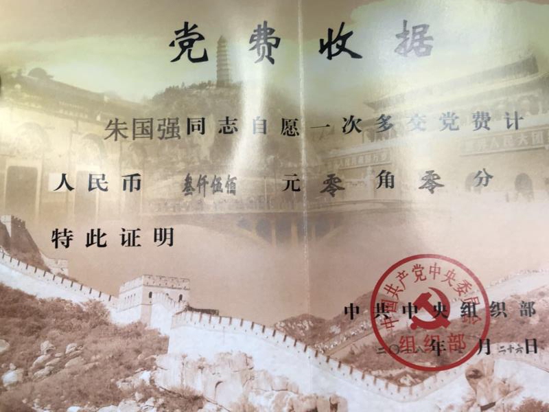 公司鉚焊車(chē)間員工、共產(chǎn)黨員朱國(guó)強(qiáng)同志,主動(dòng)將自己獲得"銅陵好人"榮譽(yù)的獎(jiǎng)勵(lì)金3500元,作為特殊黨費(fèi)上交,受到中央組織部的充分肯定和贊揚(yáng),并頒發(fā)特殊《黨費(fèi)收據(jù)》證書(shū)。